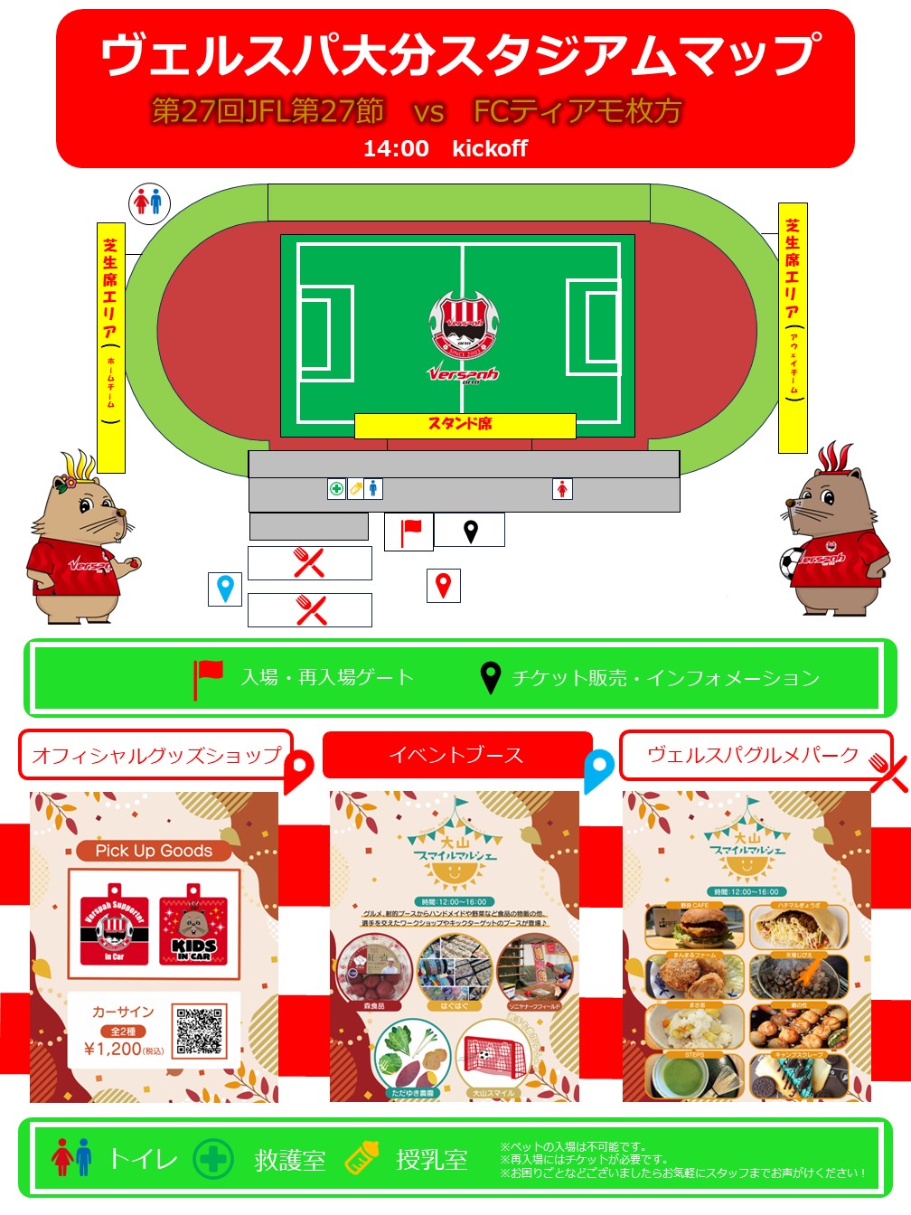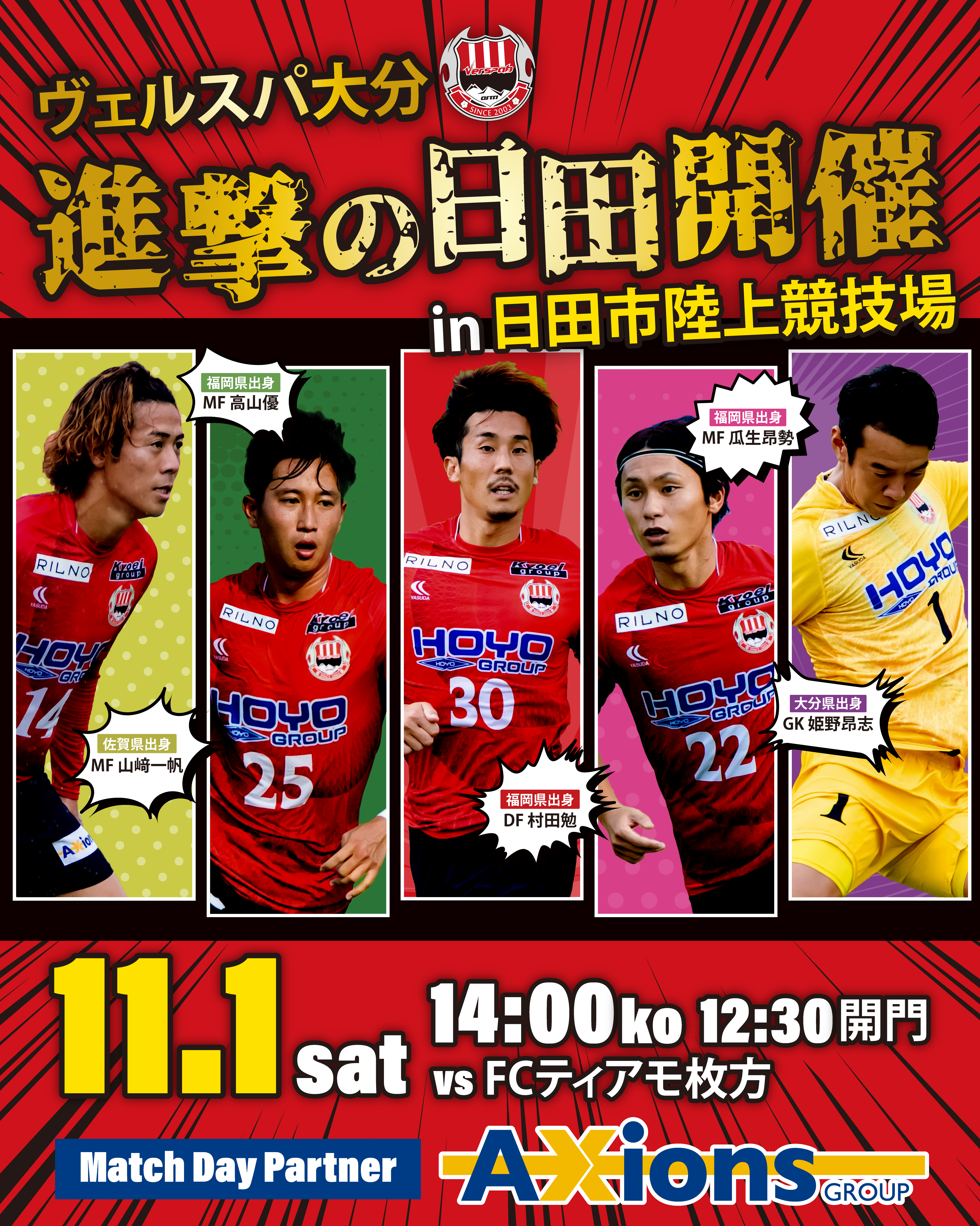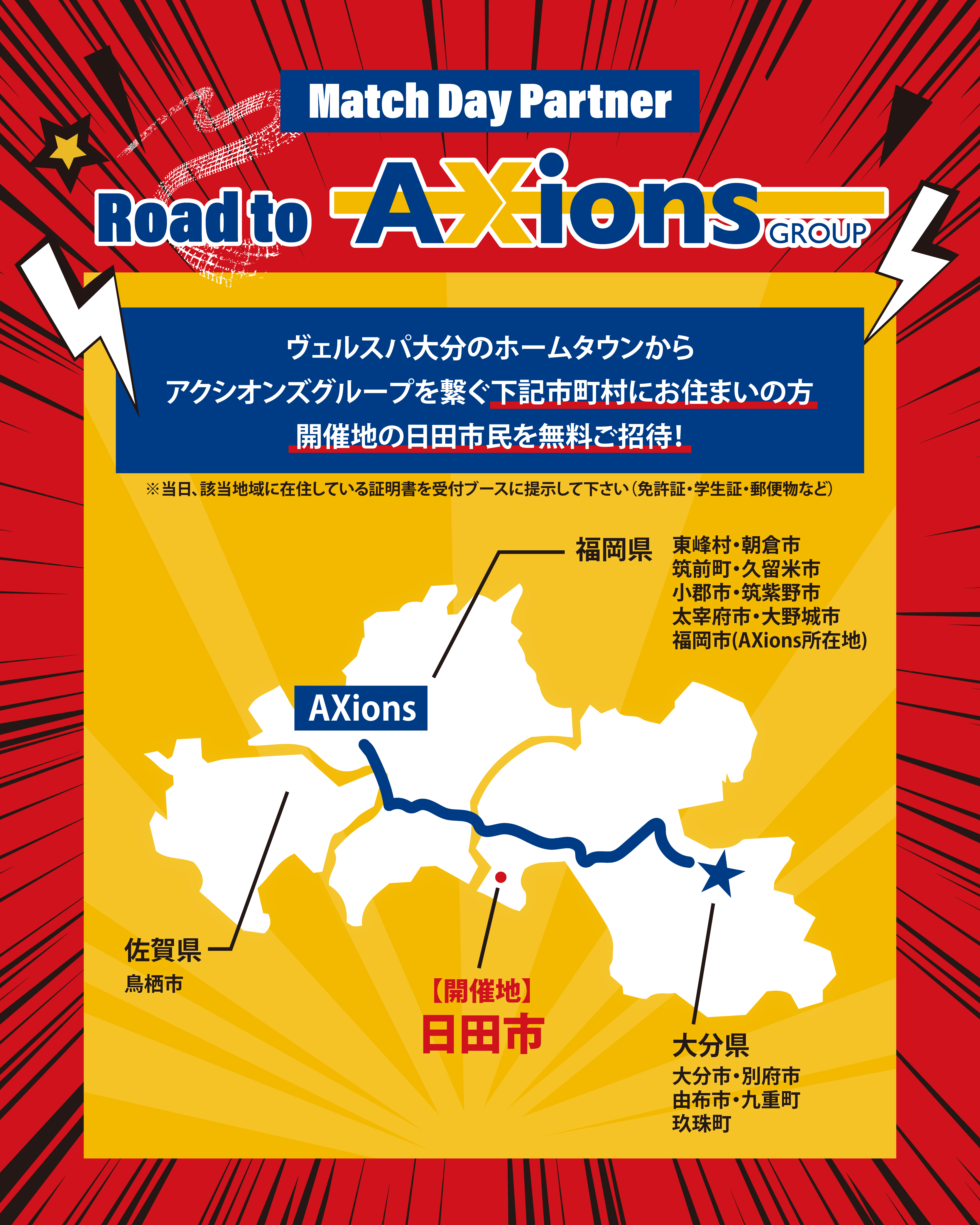 この試合につきましては、※ヴェルスパ大分ホームタウンからアクシオンズグループを繋ぐ地域にお住まいの方・日田市にお住まいの方は、入場料無料となります!