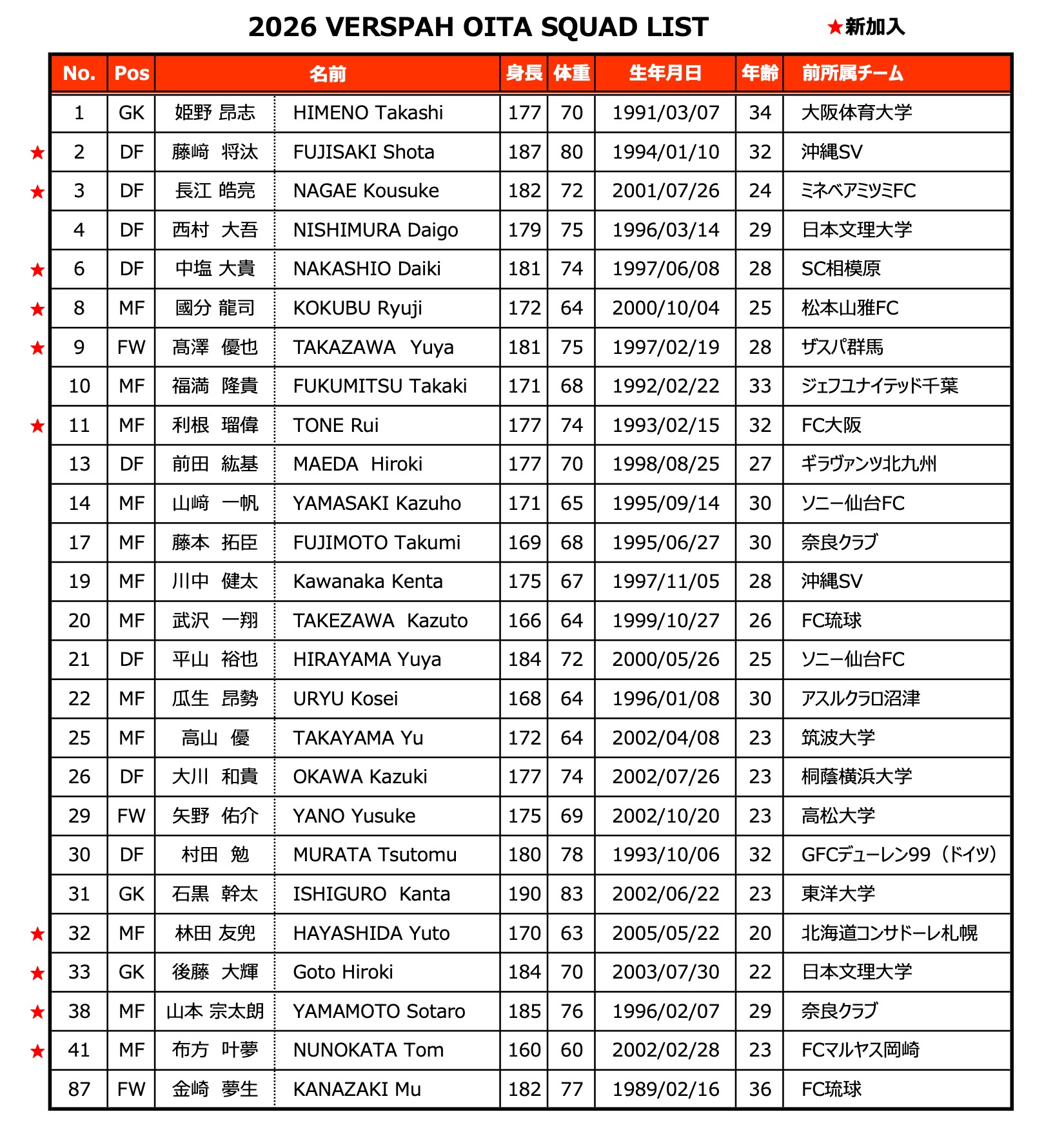 2026シーズンのヴェルスパ大分トップチーム新体制および背番号が決定致しましたので、お知らせいたします。